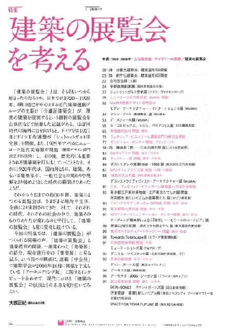 建築学会誌『建築雑誌4月号』の小特集「建築の展覧会を考える」を監修させていただきました。以下9名の方々に寄稿を寄せていただき、全体を構成しました。(※敬称略)遠藤信行(ギャラリー・間代表)、長谷川祐子(東京都現代美術館事業企画課長/多摩美術大学芸術学科特任教授)、寺田真理子(キュレータ/横浜国立大学大学院建築都市スクールY-GSAスタジオ・マネージャー)、野村しのぶ(東京オペラシティーアートギャラリーキュレーター)、酒井一光(大阪歴史博物館学芸員)、平昌子(TAIRA MASAKO PRESS OFFICE主催)、米山勇(東京都江戸東京博物館助教授)、保坂健二朗(東京国立近代美術館研究員)、清田とき子(国際交流基金芸術交流部造形美術課長)
