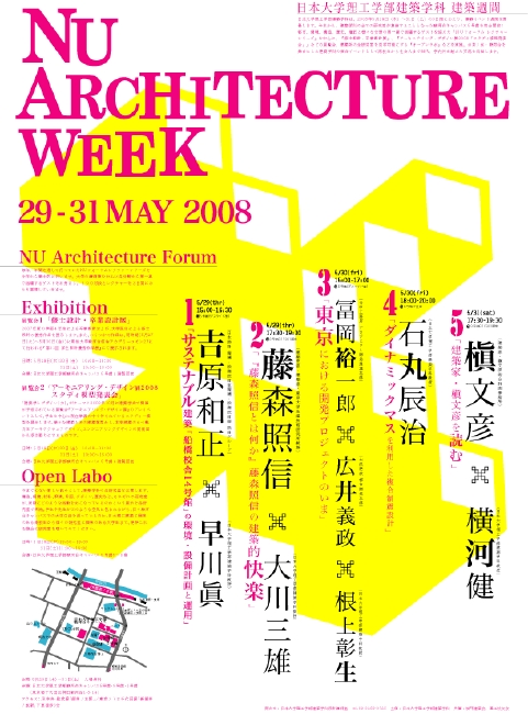 日本大学理工学部建築学科が今年度から5月29日〜31日の3日間に集中的に開催する建築系イベント「NU ARCHITECTURE WEEK」の広報及びヴィジュアルのサポートを行っています。槇文彦さん、藤森照信さんらをゲストに迎えるレクチャーシリーズや、高校生や大学生を対象とした全研究室を公開するオープンラボ、その他卒業制作や修士設計の展覧会などを複合的に行うイベントです。また、今年を始まりとして、徐々に地域を取り込んだイベントとして発展することを目指すものです。