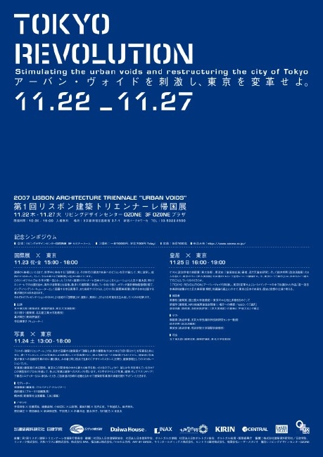 今年の5月31日から7月31日まで、第一回リスボン建築トリエンナーレ2007がポルトガルで開催された。日本は、会場の最初を飾るカントリー・エキシビジョンに参加し、東京に焦点をあてた4つの展示プログラムを構成した。今回、帰国展を11月22日から11月27日にかかけて新宿OZONEにて開催。それに合わせて、3日連続の記念シンポジウムを行う。テーマは「国際展」、「写真」、「皇居(都市)」の3つ。展覧会への出展者を中心にして、外部からゲストを招き、今回の展示にとどまることにない議論を生み出す。