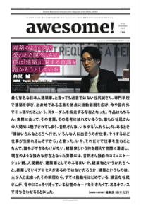 建築タブロイドマガジン『awesome!』の創刊を記念して、トークイベントを開催。創刊号を飾った中村真広さんの拠点、渋谷のco-baを会場に、媒体立ち上げに際し、試験的なインタビュイーになっていただいた5名の方々が集結!皆で、一斉に「今」と「未来」の建築の問題&可能性について、話が展開されました。来場いただきました皆様、ありがとうございました!