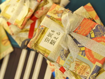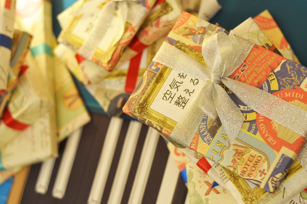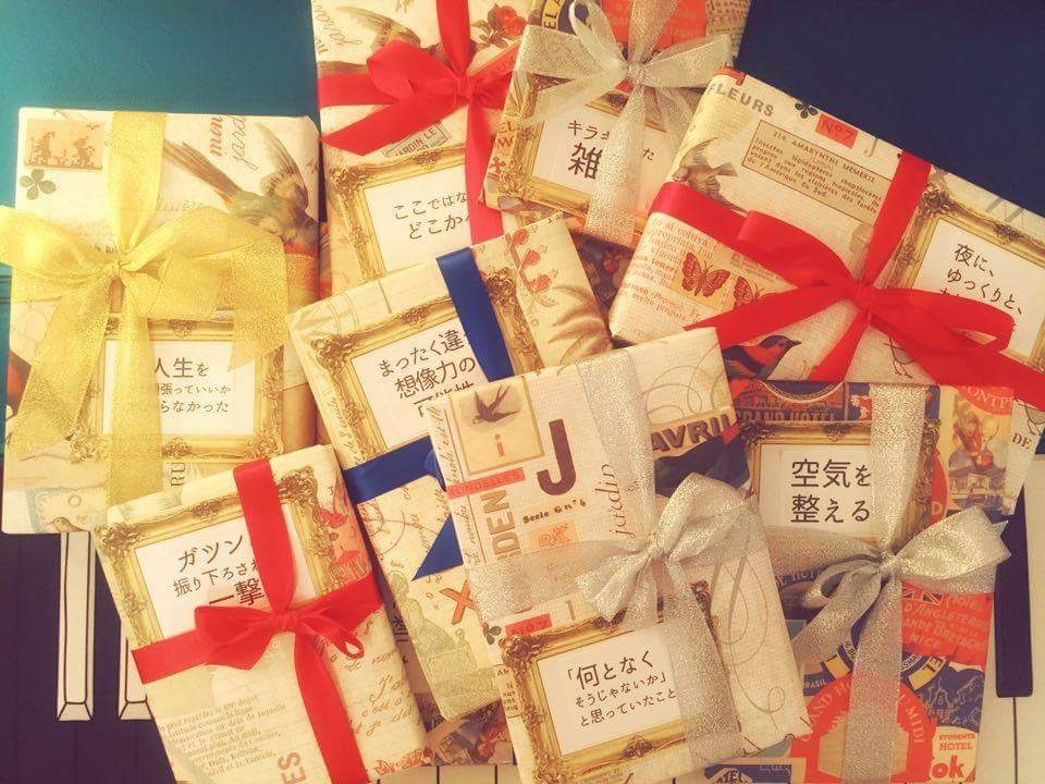 参加者の皆さんから、推薦いただく本のタイトルメッセージがどしどし届き始めました。書籍を購入し、メッセージと連絡先が記された手紙を合わせて、一つひとつ丁寧に包みました。包装紙には輸入物を使いました。